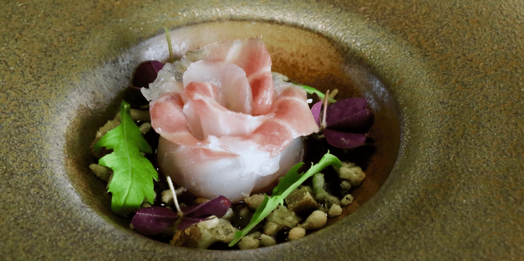 Flor de lubina Aquanaria, emulsión de barbacoa china, ensalada de anisados y piña, y tenkasu