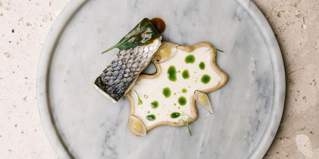 Lubina Aquanaria, escabeche de la huerta y emulsión de manchego